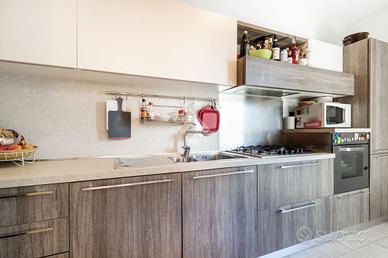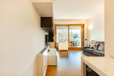 Il soggiorno ha l'accesso al terrazzo dotato di sistema di vetrate scorrevoli che valorizza l'appartamento, ulteriore spazio aggiuntivo fruibile tutto l'anno.