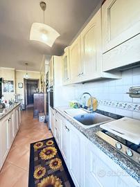 salone ampio e luminoso con cucina open space,un disimpegno che porta alla camera da letto matrimoniale e cameretta, un comodo ripostiglio, due bagni entrambi finestrati e due terrazzi lineari vivibili.