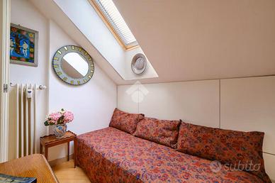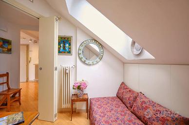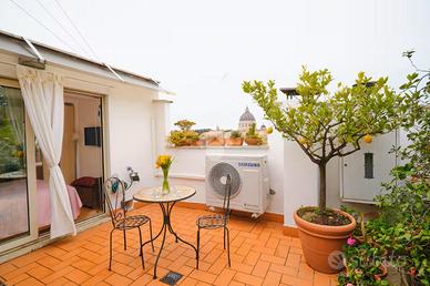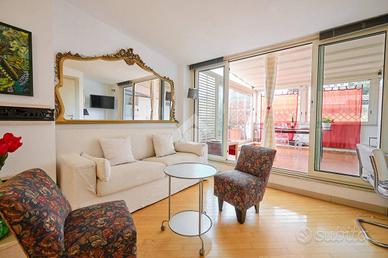L'abitazione è posta al nono ed ultimo piano di una palazzina in ottimo stato, servita da ascensore fino all'ottavo piano. Si presenta come un appartamento dagli ambienti moderni e accoglienti: luminoso soggiorno dotato di camino funzionate ed accesso al grande terrazzo attrezzato con pergotenda chiusa con vetrate removibili, che crea un ulteriore spazio vivibile per pranzare e godere della zona giorno all'aperto, cucina funzionale e ben organizzata, camera da letto matrimoniale con accesso anch'essa al terrazzo con vista unica su San Pietro, cameretta/studio e servizio dotato di vasca e finestra.
