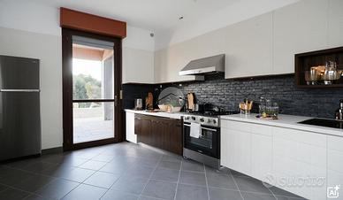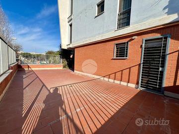 Completa la proprietà: un' area esterna suddivisa in 100 mq di giardino pavimentato, 100 mq di giardino a terra,15 mq circa di area verandata, e due posti auto.