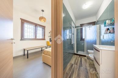 La zona giorno si apre su un accogliente soggiorno con angolo cottura, perfettamente integrato e progettato per ottimizzare gli spazi. La presenza di una grande porta finestra consente l'accesso al primo spazio esterno abitabile, esposto ad ovest, che regala luce naturale durante tutto il pomeriggio e una piacevole vista libera sul contesto circostante. L'ambiente, caldo e contemporaneo, si distingue per le finiture di qualità, la pavimentazione in grès porcellanato e i serramenti in legno con doppio vetro camera, dotati di inferriate, zanzariere e avvolgibili elettrici, a conferma di un'attenzione al comfort e alla sicurezza domestica.