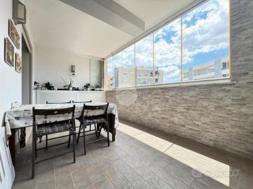 La soluzione internamente si compone di ingresso, ampia zona living con cucina a vista del marchio Pedini con accesso ad un balcone di servizio accessoriato con vetrate oscuranti, camera matrimoniale, camera singola, due bagni entrambi finestrati di cui uno a servizio della camera padronale, ampio terrazzo rifinito con armadiatura in alluminio e vetrate Vepa panoramiche.