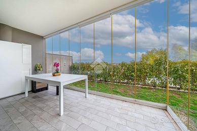 La presenza di un portico chiuso con vetrata scorrevole rappresenta un naturale prolungamento della zona giorno, creando uno spazio versatile e fruibile in ogni stagione, ideale come area relax, zona pranzo aggiuntiva o ambiente conviviale.