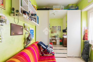 L'immobile si apre su un ingresso che conduce all'ampio soggiorno con accesso al balcone. La zona notte è composta da una camera matrimoniale e da una cameretta, mentre la cucina abitabile, separata, dispone di un secondo balcone. Il bagno è finestrato e dotato di vasca. Completano la proprietà un ampio ripostiglio e una cantina di pertinenza.