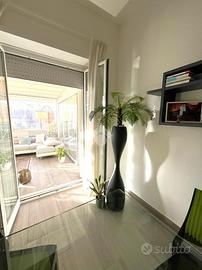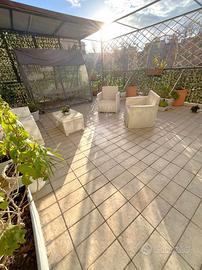 Una prima area ospita un elegante salotto coperto a vetri con pergotenda, un autentico secondo living fruibile in ogni stagione: caldo e accogliente d'inverno, completamente apribile in estate per godere del sole e dell'aria aperta. A completare lo spazio, una seconda zona open-air, ideale per momenti di relax o convivialità all'aperto, aggiunge versatilità e libertà d'uso. Un comodo ripostiglio conclude la proprietà, garantendo funzionalità senza compromettere il design raffinato dell'intero terrazzo.