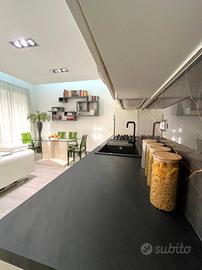 La zona living, sviluppata in un ampio open-space, si distingue per un elemento di forte impatto: una parete/isola in cemento dal design contemporaneo, realizzata su misura per coniugare estetica e funzionalità, diventando il fulcro visivo e l'elemento distintivo dell'ambiente.