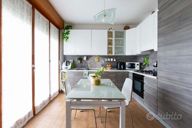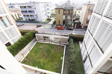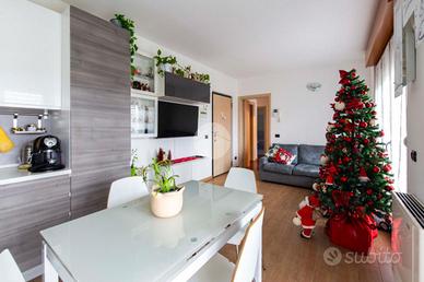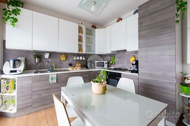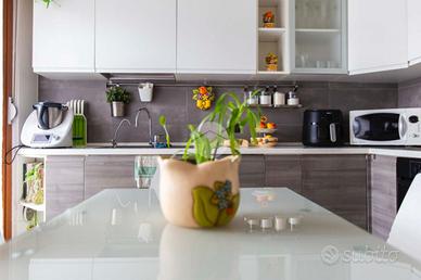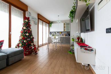 L'appartamento risulta essere così composto: ingresso diretto nella zona living con cucina a vista, doppiamente esposta e con portafinestra che permette l'accesso all'ampio terrazzo della casa, con piacevole affaccio su verde condominiale.