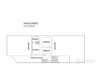 L'alloggio è composto da ingresso sulla cucina, disimpegno, bagno e due camere da letto non collegate internamente.