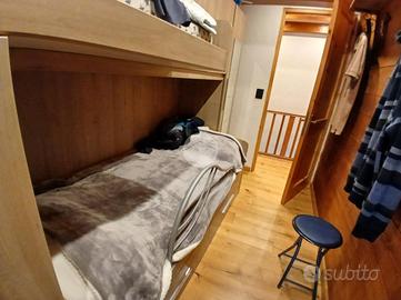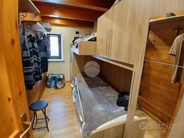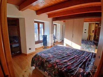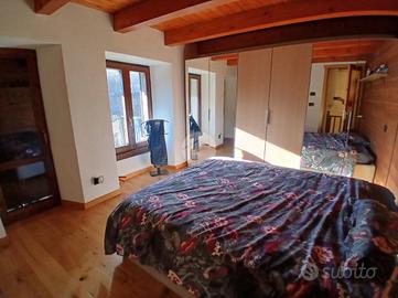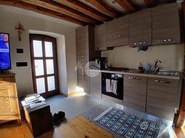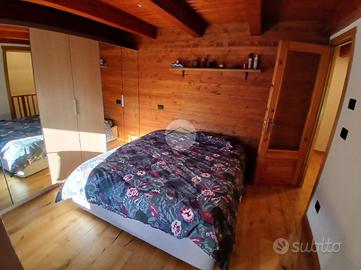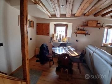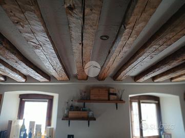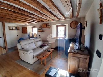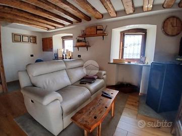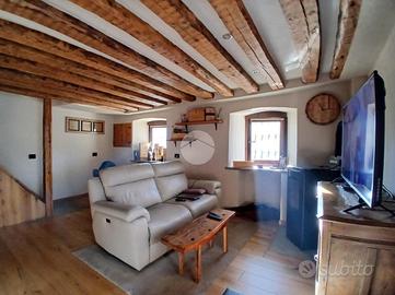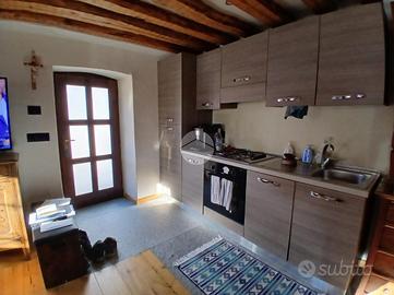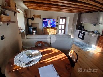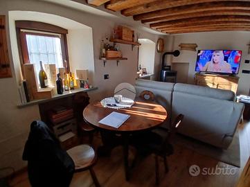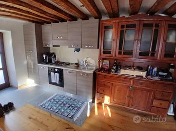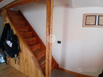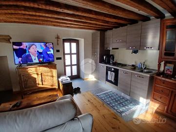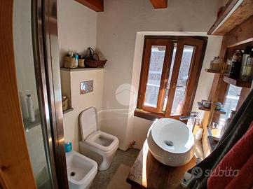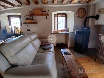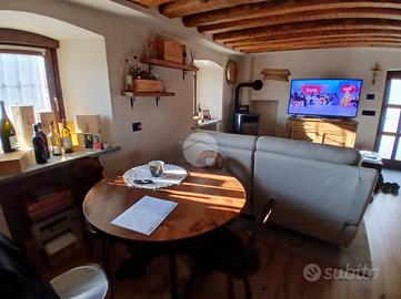 Al piano seminterrato vi è una bellissima taverna con stufa a legna, un cucinotto e un servizio finestrato; al piano terra, ingresso su cucina open space, luminosa e ben organizzata con pavimento in rovere e travi in legno originali ripulite e levigate con piccoli faretti che rendono la stanza molto più grande e luminosa ;tramite scala interna in legno, si accede alla zona notte con studio, camera matrimoniale con uscita sul balcone e un servizio finestrato.