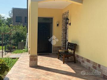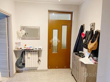 In bifamiliare, appartamento di ampia metratura di 130 mq. posto al primo e ultimo piano, con abbinato giardino di proprietà di 170 mq. recintato, oltre a box doppio, una tettoia e n. due posti auto. Dal portico coperto in comune con l'altro appartamento, si ha accesso alla scala privata, con ripostiglio/sottoscala, che conduce all'appartamento dotato di un comodo disimpegno d'ingresso.