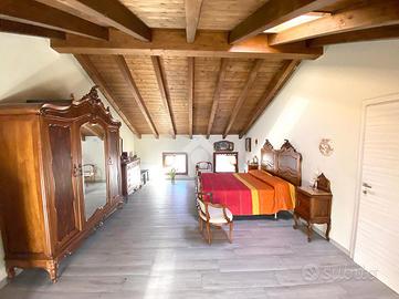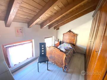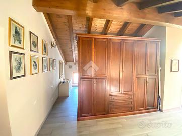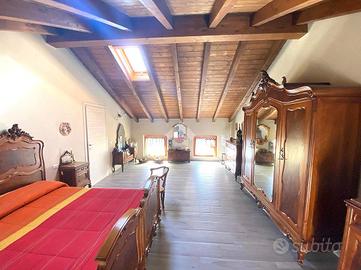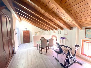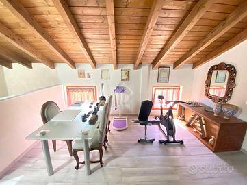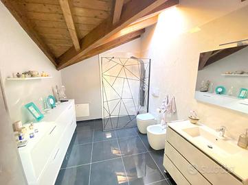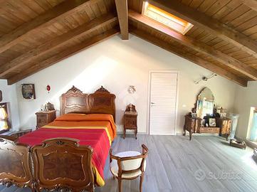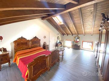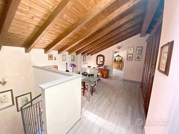 In soggiorno, la scala in marmo conduce al piano mansardato destinato a zona notte dotato di finestre a pavimento e velux, che comprende una zona pluriuso aperta, una grande camera matrimoniale, con possibilità di dividerla in due locali, e un locale studio diviso da armadiatura, oltre a un secondo bagno completo con doccia.