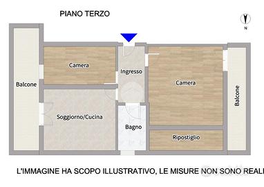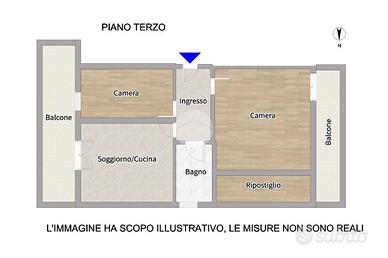 La soluzione si compone di ingresso, soggiorno con angolo cottura, due camere da letto e bagno finestrato con box doccia.