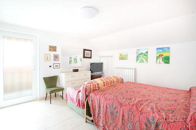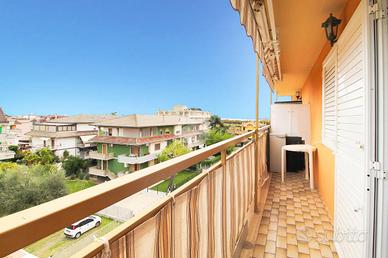 Dalla zona giorno si accede al balcone esposto a Est, da cui è possibile godere di una piacevole vista panoramica fino al mare. La camera da letto matrimoniale dispone di balcone privato.