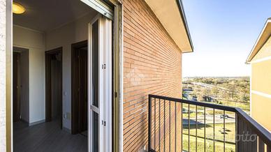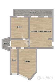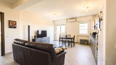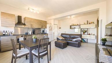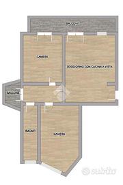 ingresso su soggiorno con cucina a vista, ambiente luminoso e con accesso al balcone condiviso anche da una delle camere da letto.