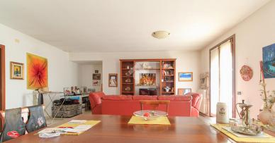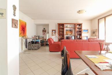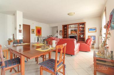 Una volta attraversato il giardino comune, salite le scale esterne e varcata la porta blindata sulla sinistra, l'ambiente si apre sulla zona giorno open space fortemente illuminata da due portefinestre, tramite le quali si accede all'ampio terrazzo con zona living esterna e vista piscina. La zona giorno comprende cucina abitabile e soggiorno.