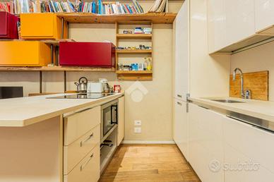 La zona giorno si distingue per il valore architettonico degli elementi originali, come le travi a vista e l'arco in mattoni, integrati in un layout openspace che unisce cucina e soggiorno in un ambiente luminoso e funzionale. La cucina a vista, dal design moderno e lineare, si inserisce armoniosamente nell'area living, creando uno spazio conviviale e ben organizzato.