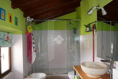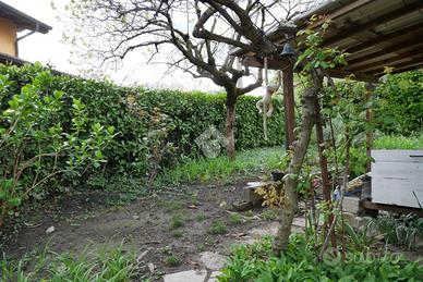 Di fronte casa, diviso dalla strada d'accesso, si trova il giardino di circa 170 mq, dove è stata realizzata una tettoia per parcheggiare l'auto al coperto di 13 mq.