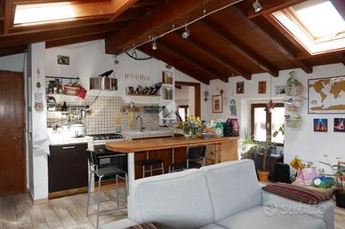 Dal pianerottolo, dove è posizionata la caldaia che gestisce il riscaldamento e l'acqua calda, si accede direttamente al soggiorno, con la cucina in muratura che si sviluppa a sinistra della porta d'entrata.