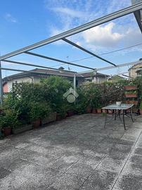 L'ingresso si apre su un ampio soggiorno, luminoso e ben distribuito, che consente di organizzare sia la zona living che la zona pranzo. La cucina, attualmente a vista, è separabile e dotata di porta finestra con accesso diretto all'ampio terrazzo, vero punto di forza dell'abitazione: uno spazio versatile, perfetto per pranzi all'aperto, momenti di relax o per chi ama il giardinaggio, grazie ai numerosi vasi disposti lungo tutto il perimetro.