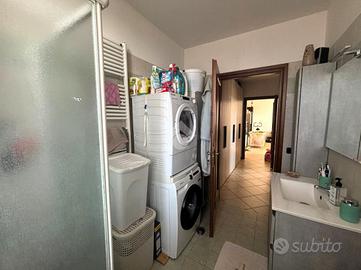 Uno spazioso corridoio conduce alla camera singola, alla camera matrimoniale e al servizio con box doccia e attacco per lavatrice.