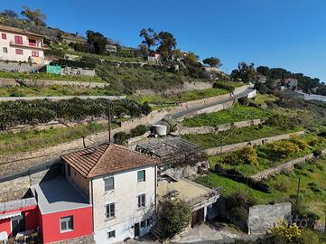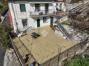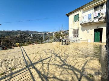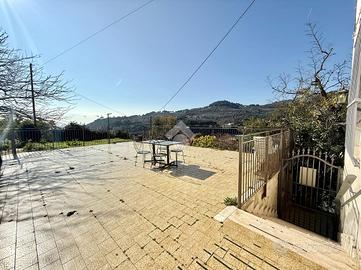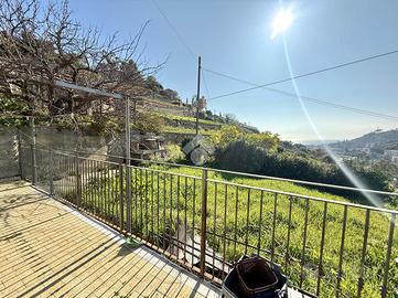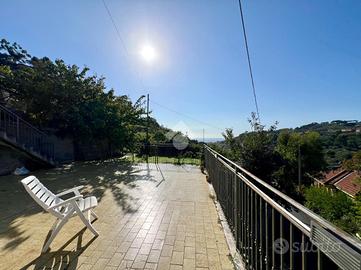 Una comoda scala esterna conduce a una splendida terrazza panoramica, da cui si può ammirare una suggestiva vista aperta sulla valle e sul mare. Completa l'area esterna una porzione di giardino privato, ideale per rilassarsi all'aria aperta o trascorrere piacevoli momenti in compagnia.