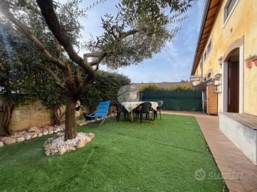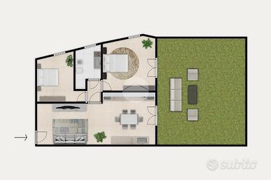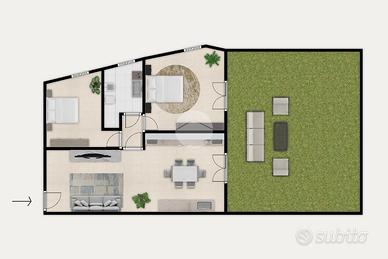 Tramite ingresso condominiale o accesso privato dal cancelletto esterno, raggiungiamo l'ingresso principale dell'immobile, ove ci accoglie la zona giorno luminosa composta da soggiorno e cucina open space con primo accesso al giardino di proprietà.