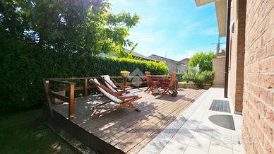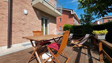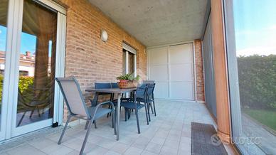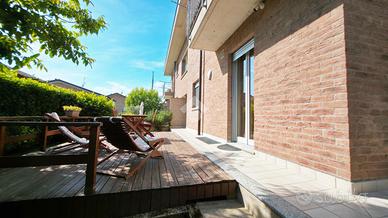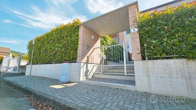 DISPONIBILE DA DICEMBRE 2025 Nel centro del Comune di San Raffaele Cimena, in complesso residenziale di nuova costruzione, comodo a tutti i servizi offerti dal paese, si propone ampio trilocale pluriaccessoriato sito al pian terreno con doppio giardino, portico e pannelli fotovoltaici da 1,1 kW. La posizione favorisce il raggiungimento autostradale del tratto Torino-Milano, la città di Chivasso, ed è anche ottimale per chi non è automunito in quanto si ha a completa disposizione il servizio di linea autobus GTT, Borello Market, scuole e parco pubblico. La porta di accesso è blindata e una volta varcata la sua soglia, l'immobile si compone di un grande soggiorno living con parete cucina avente il piano a induzione e duplice portefinestre che collegano l'accesso al portico esterno, il quale perimetro è delimitato da una zanzariera con struttura scorrevole. Il disimpegno collega i vani dedicati alla zona notte, tra cui due camere da letto ed un bagno di generose dimensioni accessoriato di ampio piatto doccia. Le aree verdi, accessibili anche dalla camera da letto tramite portafinestra, sono delimitate da siepi di Lauroceraso e Photinia, garantendo una maggiore riservatezza all'interno del proprio perimetro di proprietà. Inoltre, un'ulteriore zona solarium costruita in legno completa l'area esterna accessoriata da punti acqua. L'appartamento è concepito con alimentazione full electric al fine di contribuire significativamente alla riduzione di emissioni di gas serra e inquinamento atmosferico. Infatti, la casa è accessoriata di pompe di calore Casa Daikin, serramenti in legno con camera in doppio vetro dotati di zanzariere, che favoriscono un'ottima efficienza energetica dell'immobile. L'appartamento dispone di un riscaldamento autonomo a pavimento, Gli split posizionati in soggiorno e camera da letto consentono di poter riscaldare e raffrescare gli ambienti. Infine, l'impianto antifurto perimetrale, volumetrico e le telecamere installate sul perimetro della cas