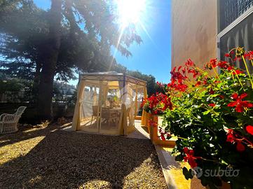 Immagina di essere a soli 800 metri dalla spiaggia e di svegliarti al mattino con il profumo del mare nell'aria e il canto degli uccelli in lontananza. Apri le finestre, lasci entrare la luce del sole e ti affacci sul tuo giardino privato, un angolo verde tutto tuo, dove potrai gustare il caffè in pigiama o rilassarti con un buon libro nel silenzio più assoluto.