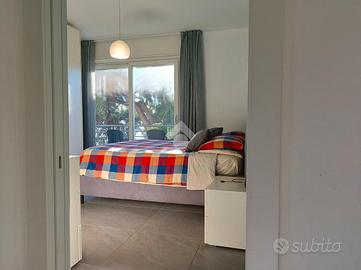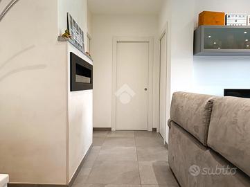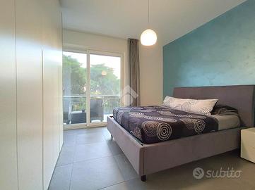 Varcando la porta d'ingresso si viene accolti da un luminoso soggiorno con cucina a vista, uno spazio ampio e conviviale che si affaccia sul terrazzo, ideale per pranzi all'aperto o momenti di relax. Una zona di disimpegno conduce alla camera matrimoniale, anch'essa con accesso diretto al terrazzo, e al primo bagno finestrato, rifinito con materiali di qualità. Completano l'abitazione un secondo bagno dotato di balcone e una seconda camera da letto anch'essa di generose diminesioni.