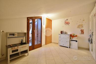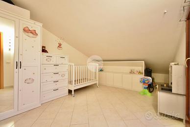 Una scala in muratura interna conduce al piano superiore mansardato, dove trova spazio un angolo TV o zona giochi, una camera per bambini con accesso ad un ampio terrazzo privato e un vano attrezzato come secondo bagno e lavanderia.
