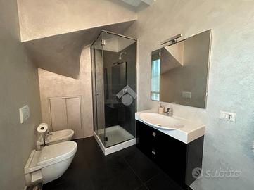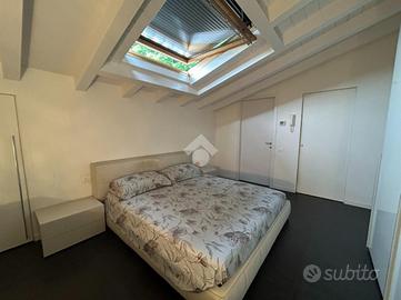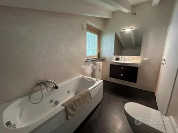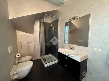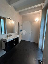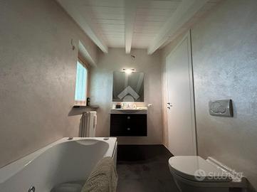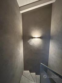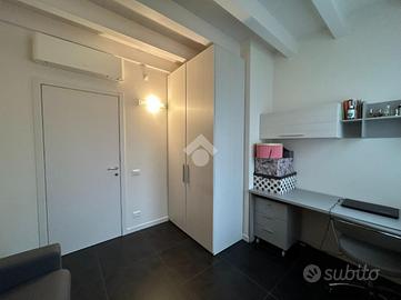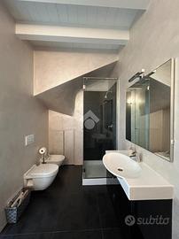 Dal disimpegno si accede alla zona notte del primo livello, composta da una camera singola e da un bagno finestrato con balcone e box doccia. La scala interna conduce al piano superiore, dove trova spazio una raffinata camera matrimoniale con cabina armadio e secondo servizio, anch'esso finestrato e completo di vasca.
