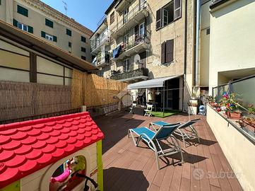 L'appartamento è situato in una delle zone più ambite di Savona, la Darsena. Posizionato in Via Chiodo, questo immobile offre una combinazione perfetta tra tranquillità e accessibilità, con tutti i servizi a portata di mano e il centro città a pochi minuti a piedi. L'alloggio si trova al primo piano di un edificio dotato di ascensore, garantendo l'accessibilità a tutte le età. L'ingresso apre su un corridoio che disimpegna tutti gli ambienti. La zona giorno comprende un soggiorno luminoso arricchito da un funzionale e pratico angolo cottura. Dal soggiorno si accede direttamente all'ampio terrazzo, soleggiato per l'intero arco della giornata. Le sue generose dimensioni permettono di organizzare cene all'aperto, momenti di relax e attività all'aperto. La zona notte comprende due camere da letto luminose e confortevoli: una spaziosa camera matrimoniale e una camera singola, anch'essa con accesso diretto al terrazzo. Il bagno finestrato è dotato di un box doccia. È presente, inoltre, la zona lavanderia, che aggiunge ulteriore praticità alla vita quotidiana. L'immobile ristrutturato in stile moderno è pronto per essere abitato sin da subito. La combinazione delle pavimentazioni di tonalità scure con pareti chiare, creano un elegante contrasto che dona un senso di spazio e luminosità agli ambienti. Gli infissi in PVC con doppio vetro assicurano un ottimo isolamento termico e acustico. Il riscaldamento autonomo permette una gestione ottimale delle spese, garantendo efficienza energetica. Soluzione perfetta per chi cerca un appartamento in una zona esclusiva come la Darsena di Savona, desiderando un ampio spazio esterno,