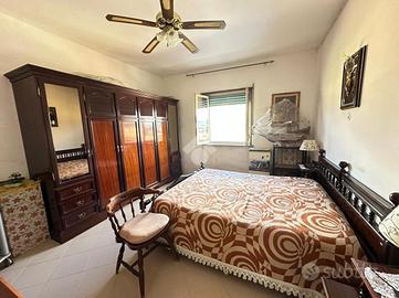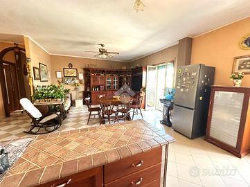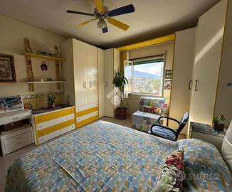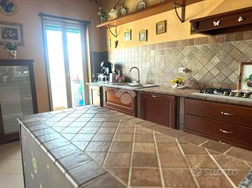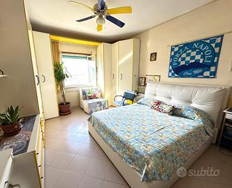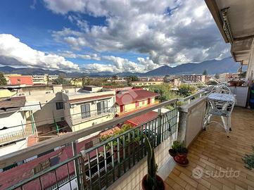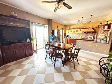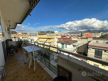 L'ingresso conduce direttamente nell'ampio soggiorno con cucina a vista, un ambiente luminoso e moderno concepito in open space per favorire convivialità e comfort. La cucina, realizzata completamente in muratura con penisola anch'essa in muratura, offre spazi ben organizzati e un carattere caldo e mediterraneo. Da questo grande ambiente living è possibile accedere, tramite due uscite indipendenti, all'ampio balcone panoramico: un vero punto di forza dell'immobile. Qui si può godere di una vista spettacolare sul Vesuvio, ideale per momenti di relax, cene all'aperto o semplicemente per ammirare il paesaggio circostante.