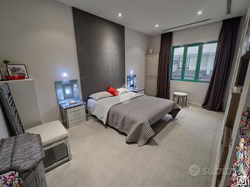 La zona notte ospita una spaziosa camera matrimoniale, silenziosa e luminosa, con una grande finestra che apre la vista sui tetti e sulle colline circostanti. L'atmosfera è tranquilla e rilassante, ideale per chi cerca un rifugio accogliente dopo una giornata di lavoro.