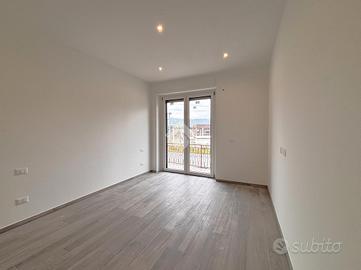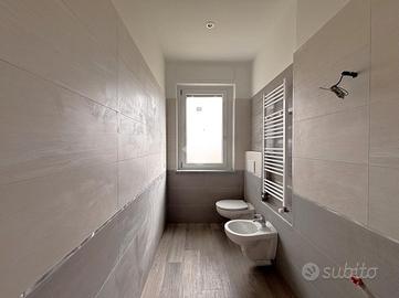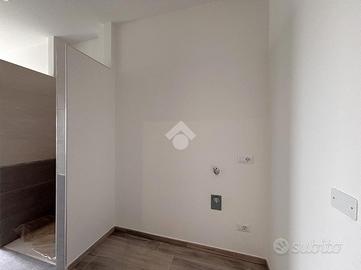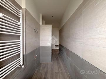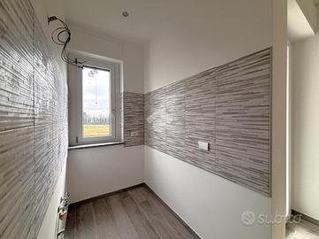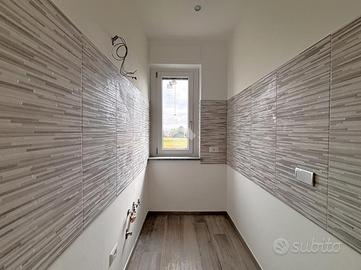 La zona giorno è composta da un angolo cottura con accesso diretto sul salotto di generosa metratura, un pratico ripostiglio ed un comodo antibagno che accompagna al bagno finestrato con doccia a muro.