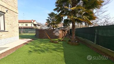 Senago confini Garbagnate Milanese, in contesto residenziale del 2017 in Classe Energetica A1, proponiamo in vendita appartamento di TRE LOCALI con Giardino Privato. L'abitazione è al piano terra e prevede l'ingresso diretto sulla zona giorno e un secondo ingresso privato indipendente sul giardino. La zona living ha la cucina a vista ed ha affaccio al giardino di proprietà di circa 250 mq. Un disimpegno con ripostiglio a muro, camera matrimoniale, seconda camera e bagno finestrato con doccia e spazio lavatrice. Riscaldamento centralizzato a pavimento, a gestione autonoma tramite cronotermostato, aria condizionata zona giorno/notte, tapparelle motorizzate: tutto gestibile tramite domotica. Porta blindata, infissi in legno a doppio vetro, zanzariere, pavimenti in gres porcellanato effetto legno, antifurto perimetrale con videosorveglianza. Impianto d'irrigazione automatica, videocitofono. Impianto fotovoltaico per alimentazione servizi delle parti comuni (luce scala, ascensore e corrente elettrica). Completo di cantina e box auto 16 mq. con basculante motorizzata. La palazzina ospita 12 famiglie e i due punti di forza di questo appartamento sono l'area esterna privata che ospita anche una esclusiva piscina e il contesto verdeggiante e silenzioso. Tempi di consegna DICEMBRE 2026.