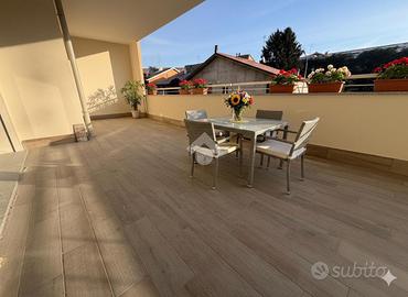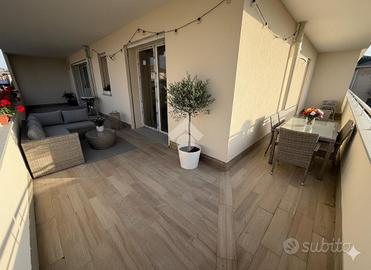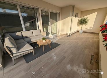 L'ingresso conduce a un'ampia zona giorno con cucina a vista, elegante e funzionale, con affaccio su un grande terrazzo coperto, ideale per vivere appieno lo spazio esterno in ogni stagione.