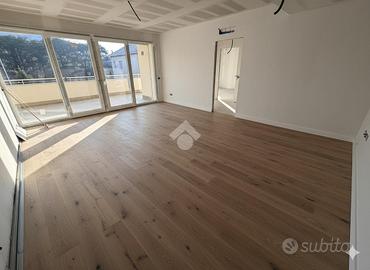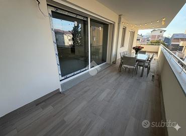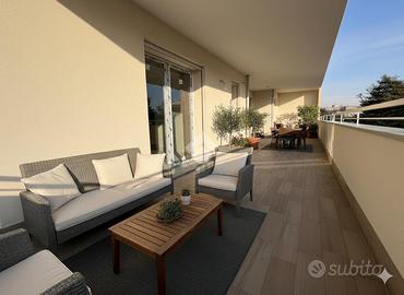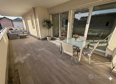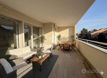L'ingresso introduce a un'ampia zona giorno con cucina a vista, elegante e funzionale, con affaccio su un grande terrazzo coperto, ideale per vivere appieno lo spazio esterno in ogni stagione.
