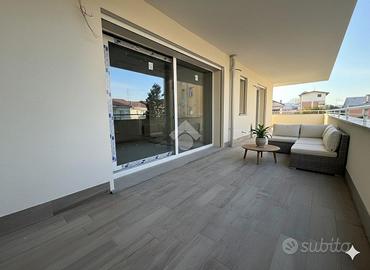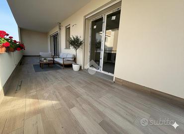 L'ingresso conduce a un'ampia zona giorno con cucina a vista, elegante e funzionale, con affaccio su un grande terrazzo coperto, ideale per vivere appieno lo spazio esterno in ogni stagione.