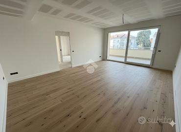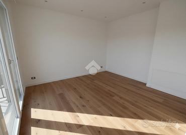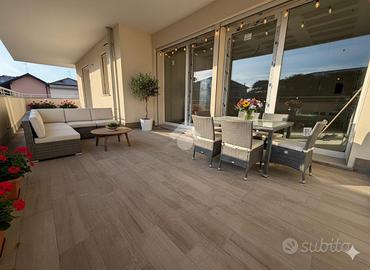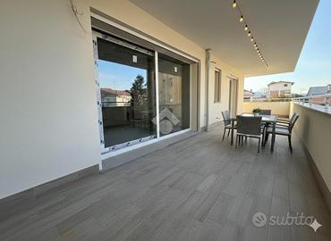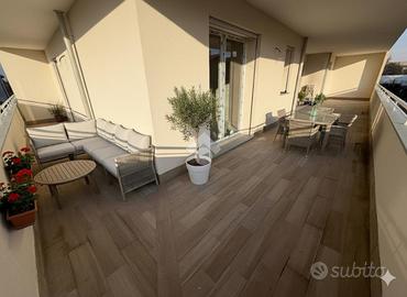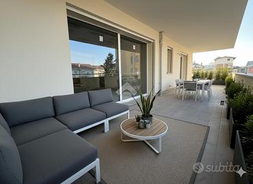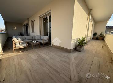 L'ingresso conduce a un'ampia zona giorno con cucina a vista, elegante e funzionale, con affaccio su un grande terrazzo coperto, ideale per vivere appieno lo spazio esterno in ogni stagione.