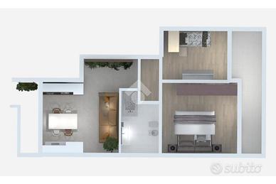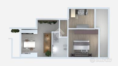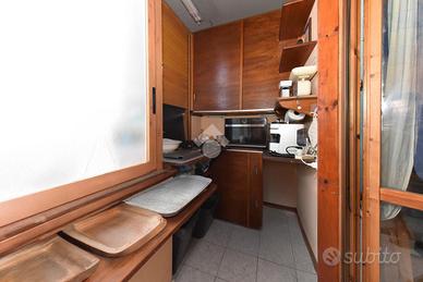 L'ingresso si apre su una zona giorno con angolo cottura, arricchita da un balcone verandato che offre uno spazio aggiuntivo perfetto per essere sfruttato tutto l'anno.