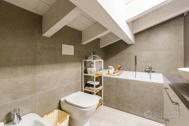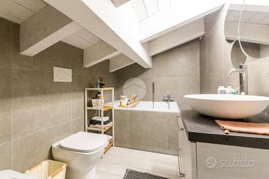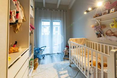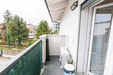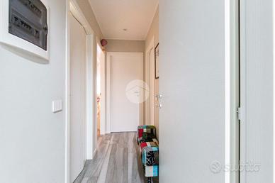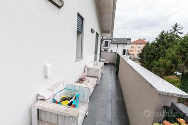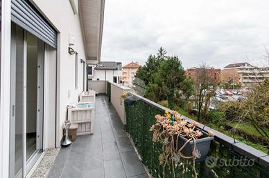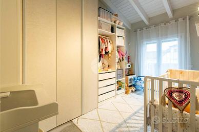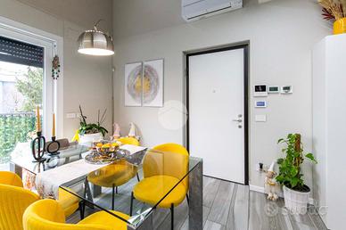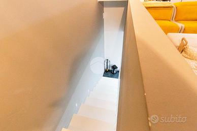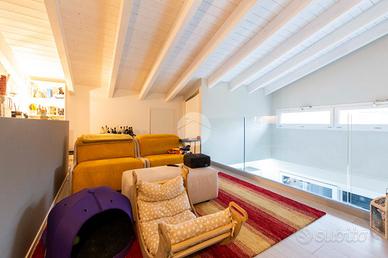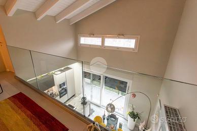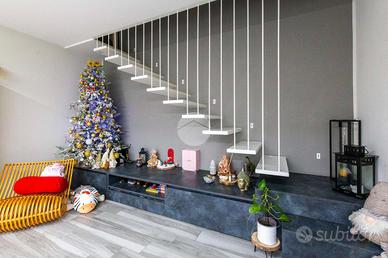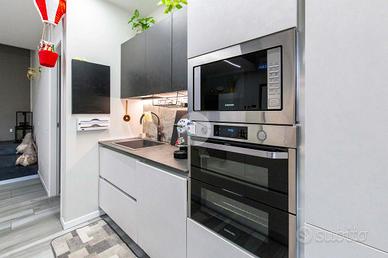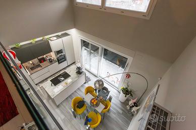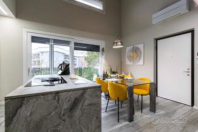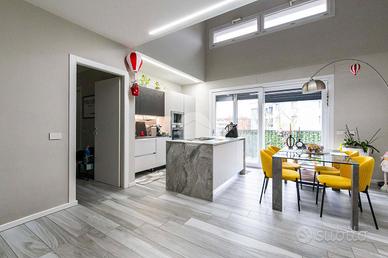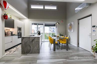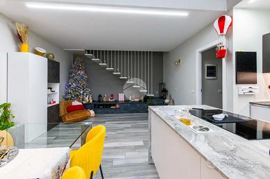 Ingresso diretto nella zona living disposta su due livelli per ottimizzare la funzionalità degli spazi, l'ambiente giorno è caratterizzato da un design contemporaneo ed è valorizzato da moderne luci a led che ne esaltano volumi e atmosfera. Di fronte si apre la cucina a vista con isola centrale, tavolo da pranzo e ampia porta finestra con zanzariere per accedere al comodo balcone con affaccio tranquillo e piacevole sul verde.