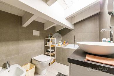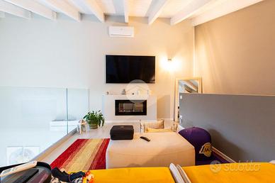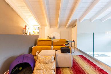 Salendo le scale, si accede al soppalco dove troviamo l'angolo conversazione con parete tv, camino di design, primo bagno della soluzione immobiliare dotato di vasca e un comodo ripostiglio; Proseguendo, tramite corridoio, accediamo alla zona notte composta da due camere da letto entrambe finestrate e con affaccio sul balcone di pertinenza, secondo bagno dotato di box doccia e un'ulteriore ampio ripostiglio utilizzabi