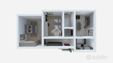 Proseguendo troviamo un bagno finestrato con vasca, una cameretta doppia e un'ampia e luminosa camera matrimoniale.