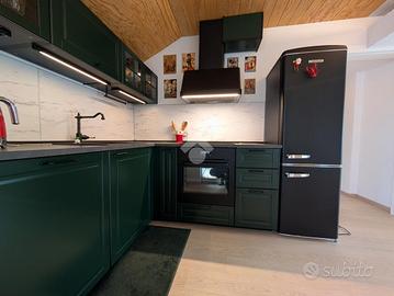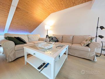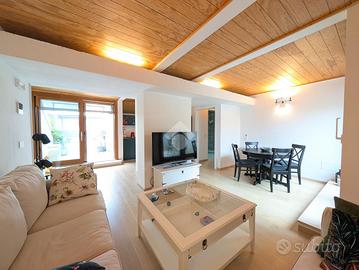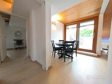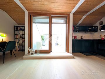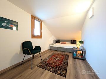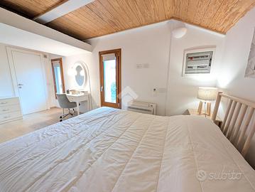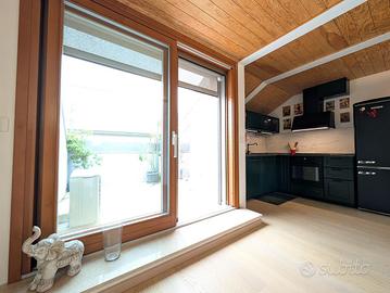 Situato al secondo piano di un contesto ordinato e ben mantenuto, l'appartamento si sviluppa su un unico livello mansardato, recentemente ristrutturato con attenzione ai dettagli. L'ingresso conduce a un'ampia e luminosa zona giorno, composta da soggiorno con angolo TV, cucina a vista e uno spazio dedicato allo studio, completo di scrivania e libreria, ideale per il lavoro da remoto. L'ambiente è ulteriormente valorizzato da due terrazzi a tasca, entrambi abitabili e con gradevoli scorci di vista lago. Su uno dei terrazzi è stato realizzato un comodo ripostiglio adibito a lavanderia.