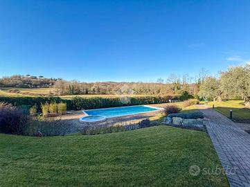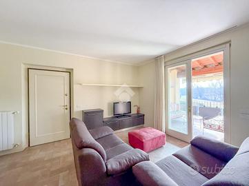 Proponiamo in vendita uno splendido trilocale situato al primo piano di un bellissimo residence di poche unità e molto ben tenuto. Si accede all' appartamento da un ampio ingresso che conduce al soggiorno con angolo cottura, con grandi vetrate che garantiscono un'ottima luminosità e permettono l'accesso diretto all'ampio terrazzo con vista piscina e verde circostante. Un disimpegno separa in modo funzionale la zona giorno dalla zona notte, composta da due camere matrimoniali e due spaziosi bagni finestrati. A completamento della proprietà sono presenti una cantina e un garage di generose dimensioni. Ottime le finiture. Completo di arredo moderno e curato. EN. We offer for sale a beautiful three-room apartment located on the first floor of an elegant, well-maintained residential complex with only a few units. The apartment is accessed through a spacious entrance hall leading to the living area with open-plan kitchen. Large floor-to-ceiling windows ensure excellent natural light and provide direct access to a large terrace overlooking the swimming pool and surrounding greenery. A hallway functionally separates the living area from the sleeping area, which consists of two double bedrooms and two spacious bathrooms with windows. The property also includes a cellar and a generously sized garage. Excellent finishes throughout. Fully furnished with modern, well-designed furniture. DE. Wir bieten eine wunderschöne Dreizimmerwohnung zum Verkauf an, gelegen im ersten Stock einer eleganten, sehr gepflegten Wohnanlage mit nur wenigen Einheiten. Der Zugang zur Wohnung erfolgt über einen großzügigen Eingangsbereich, der in den Wohnbereich mit offener Küche führt. Große Fensterfronten sorgen für eine hervorragende Helligkeit und ermöglichen den direkten Zugang zur großen Terrasse mit Blick auf den Swimmingpool und das umliegende Grün. Ein Flur trennt funktional den Wohnbereich vom Schlafbereich, der aus zwei Doppelzimmern und zwei großzügigen Tageslichtbädern besteht. Zu