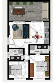 Un disimpegno separa in modo funzionale la zona giorno dalla zona notte, composta da due camere matrimoniali e due spaziosi bagni finestrati.