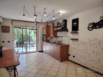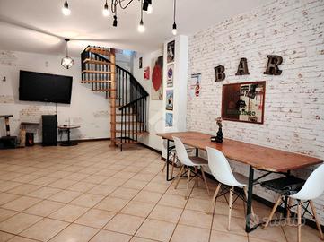 A seguire, una scala a chiocciola collega il soggiorno al piano seminterrato piastrellato, costituito da un locale versatile che vanta di una grande porta finestra con accesso all'area esterna, composta in parte da un porticato coperto ed in parte da giardino, perfetti per godersi del tempo all'aperto.