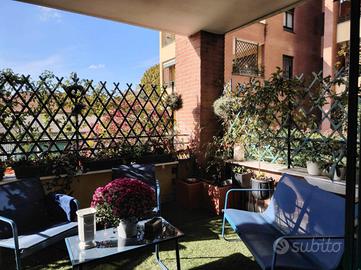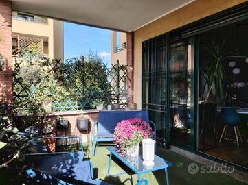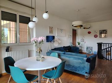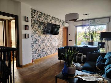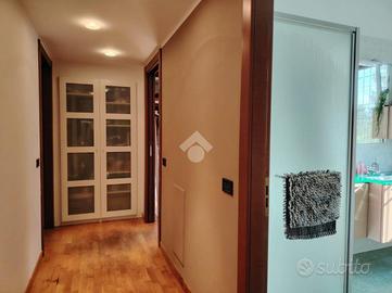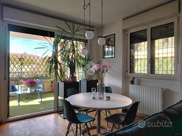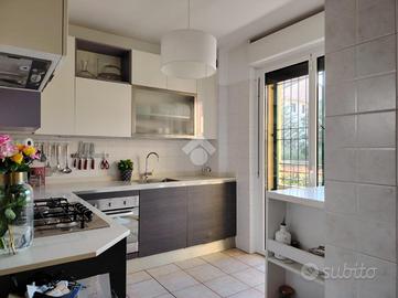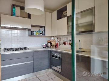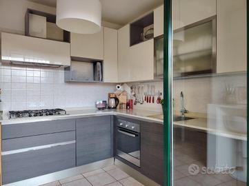 L'ingresso si apre direttamente su un luminoso soggiorno che accoglie la zona living e un'area pranzo. Da qui si accede direttamente al terrazzo che prosegue come balcone fino alla cucina abitabile, pensata per chi ama cucinare in comodità.