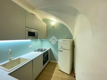 In posizione centrale al paese appartamento bilocale arredato al piano terra in corte del '400. Soggiorno cottura, bagno con doccia e lavatrice, camera matrimoniale e studio con salotto.Sono escluse dal canone le utenze : luce/gas/acqua e la tari). Sono richieste referenze lavorative dimostrabili.